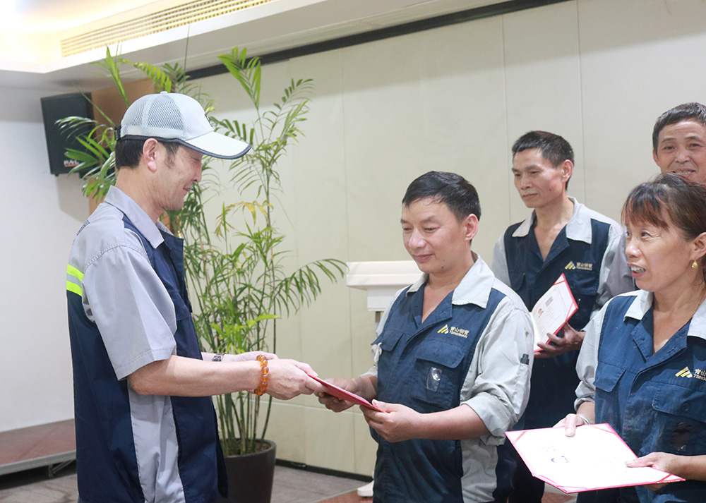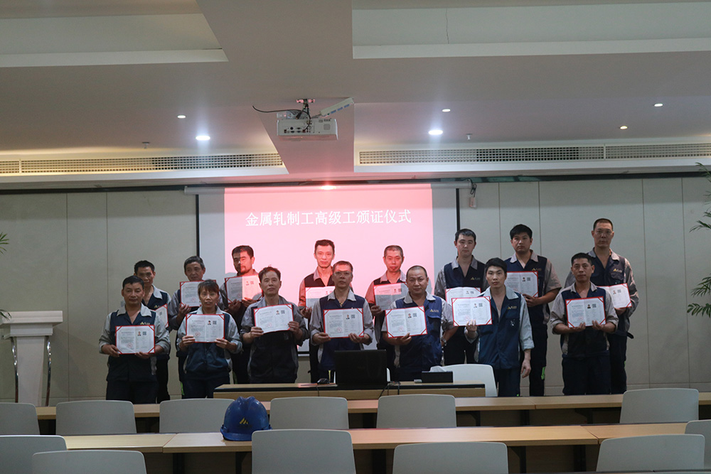 6月28日下午,青山钢管首批金属轧制工高级工颁证仪式在行政楼四楼培训室举行,该证经浙江省人力资源和社会保障厅备案,此次共21名员工取得了由企业自主评价认定的职业技能等级认定金属轧制工高级工证书。公司无缝管事业部总经理陈光森出席仪式并为通过考试的员工颁发证书。