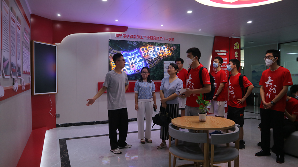 在党群活动服务中心,李墩镇政府工作人员向师生们进行介绍,园区党建以中共青山钢管福建分公司党支部和福建盟信集团有限公司党支部为引领,以点带面争取有识之士壮大党群队伍,以党建促生产,不断促进企业更好发展。