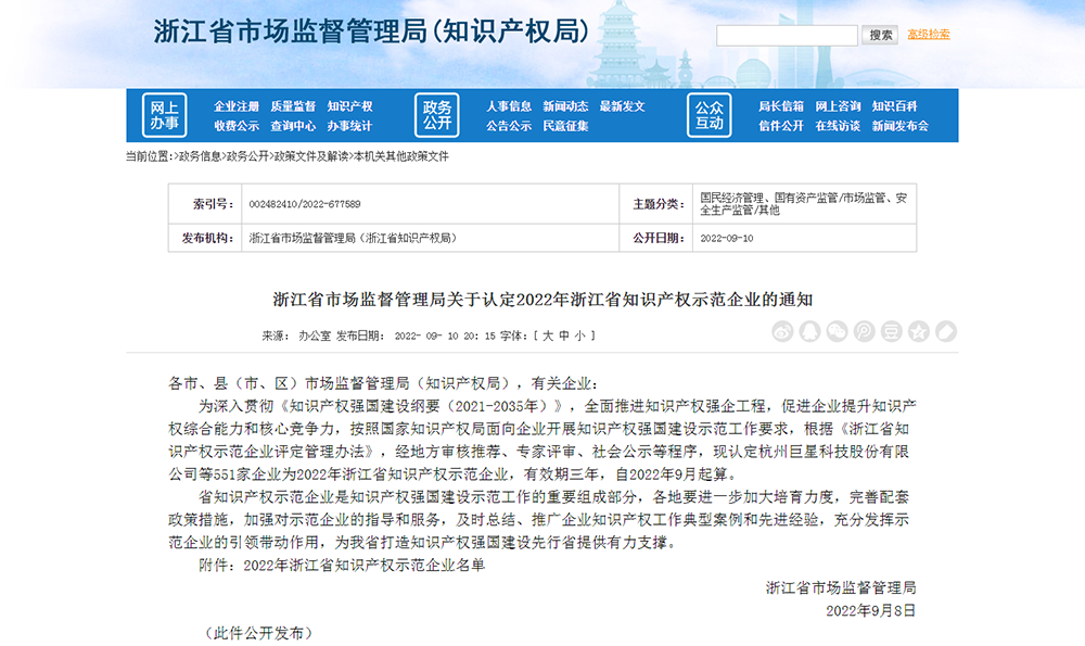 近日,浙江省市场监督管理局(知识产权局)公布了“2022年浙江省知识产权示范企业名单”,经审核、评审等一系列环节后,青山钢管有限公司从众多申报企业中脱颖而出,获评2022年浙江省知识产权示范企业。